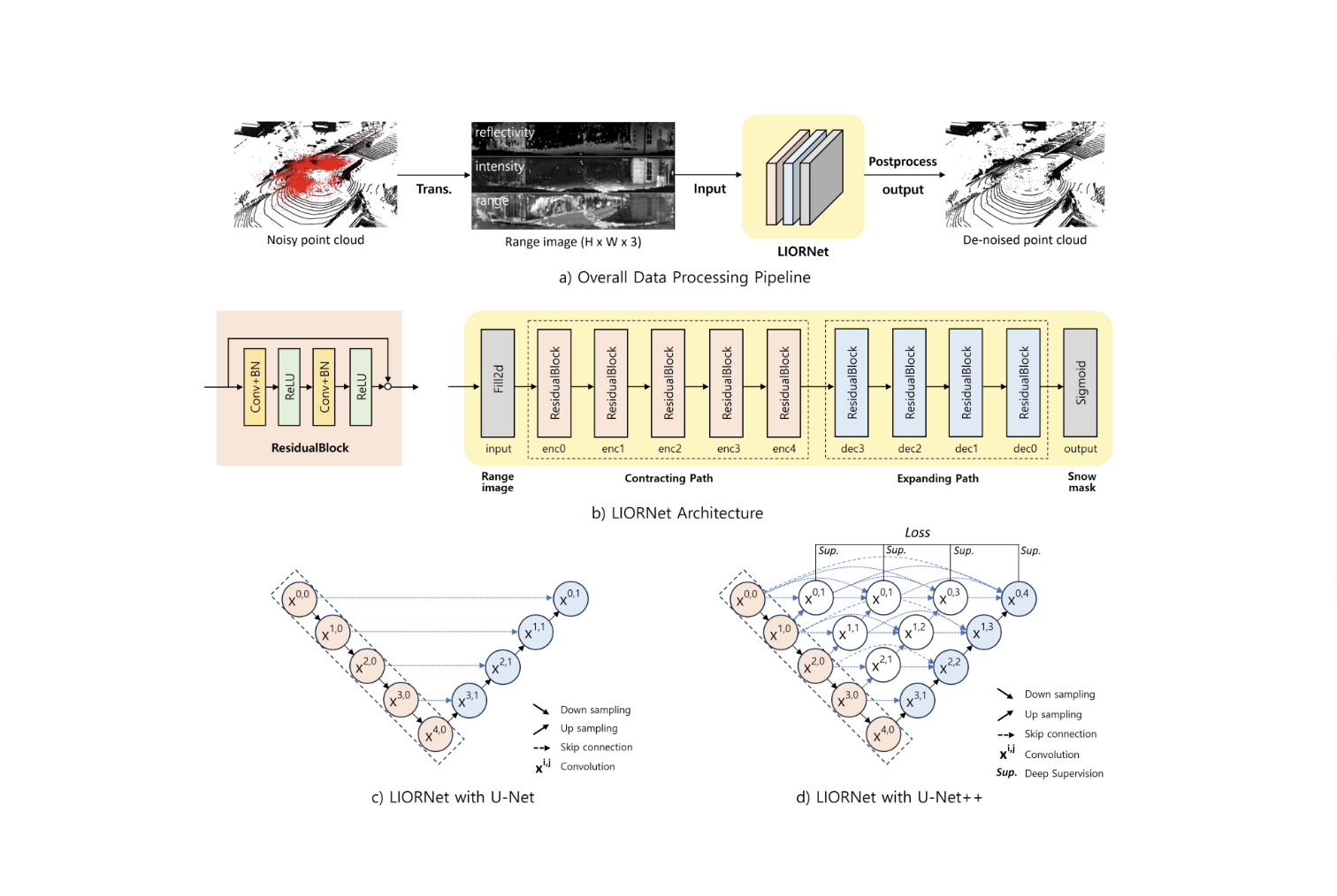 Overall LIORNet framework: (a) data processing pipeline, (b) network architecture, and backbone configurations using U-Net (left) and U-Net++ (right).